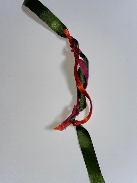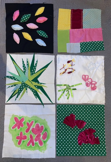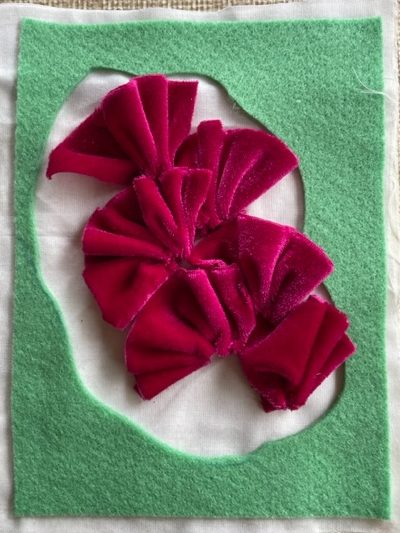 For this textile, I selected a dark green cotton fabric as the background cutting it 30cm by 30cm. I wanted to expand on the three dimensional flowers that I made in Project 2. Using the same velvet fabric, I cut thicker strips than the small version because I wanted to make big flowers. I am pleased I did because the fabric flowed more with the larger strips which created a better overall look.