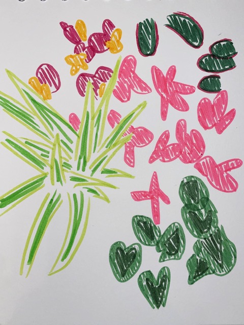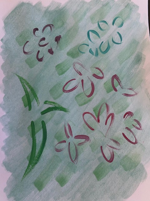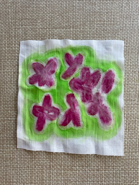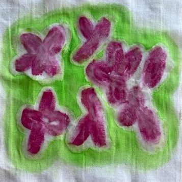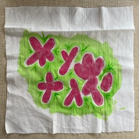 The batik I did for Project 3 was the first I’d done in many years. I pretty much did the same thing as the small textile but this time I refined my technique. I forgot that when you have finished the dying of the fabric, you’re meant to iron the wax out to bring it back to a normal fabric with no wax. I painted the pink flowers, covered them in wax and then dyed the fabric green. Once it was dry, I went back in with a darker shade of green and made the little flicks coming out from the flower. When that was done, I ironed out the wax sandwiching it between some sheets of brown paper that soaked the wax up.