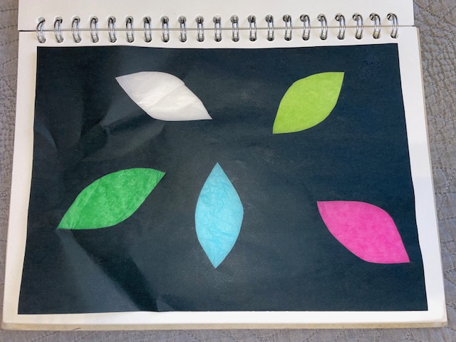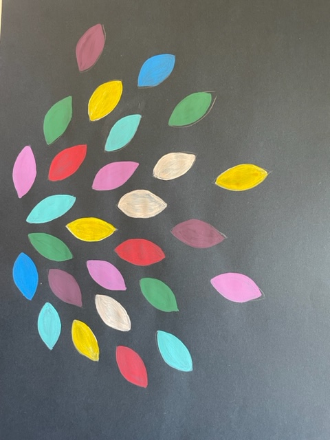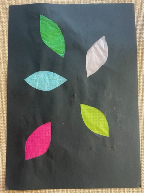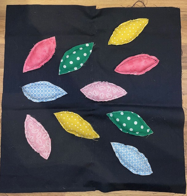 I chose to do something slightly different to the sample textile. Still using the black fabric, this time I wanted to make three dimensional leaves that stick out of the fabric. I made 10 leaves of about 8 cm in size and 5 different colours. I stitched the back and front of the leaf together using black thread and a back stitch leaving a little hole to put stuffing inside. When the stuffing was in, I closed the leaf up and attached them to the black backing fabric using the same black thread. This was a successful piece and I achieved what I wanted to do.